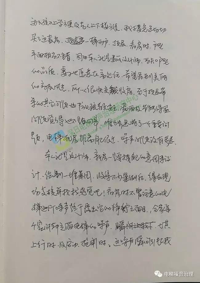 “其实在解决电梯噪音的过程中,麻烦的地方不是找不到解决方法,而是很少人了解电梯低频噪声。幸好我通过自己的坚持,找到了深日公司,通过运用专业的降噪方案终彻底解决了电梯噪音。在此,我将我的电梯降噪成功经历分享出来,其实是希望能给其他受困业主一些力量与支持。”电梯降噪完成后,多才多艺的刘先生还将电梯噪声防治经历手写成了“事件日记”,感兴趣的可以点击[敏感词]标题阅读。