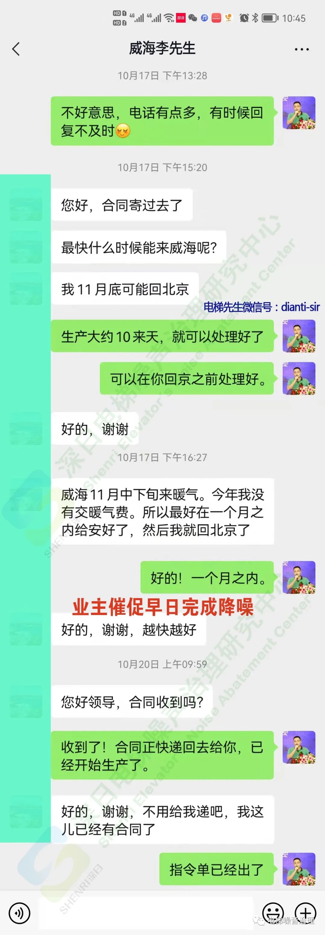 文章内的电梯降噪项目位于北京,电梯噪音基本情况和我家类同,也是顶层住户受到严重的电梯噪音干扰,但是这个项目因为疫情原因还未复工。刚好我也在北京,于是我就问电梯先生,能否在项目复工后告知我,我也好去看下电梯降噪现场,了解下深日电梯降噪技术是否真实可信。电梯先生表示同意。