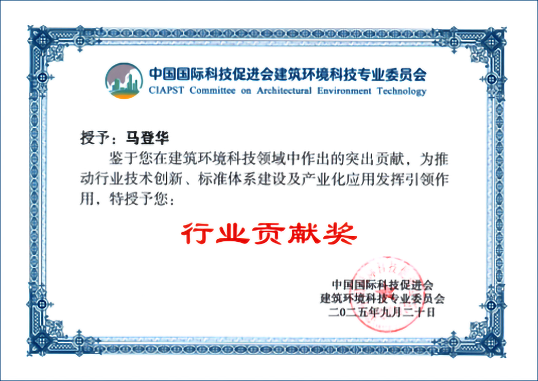 鉴于我司创始人马登华先生在建筑科技领域努力,为推动行业技术创新、标准体系建设及产业化应用发挥引领作用,被中国国际科技促进会建筑环境专业委员会授予“行业贡献奖”,在此掌声祝贺!